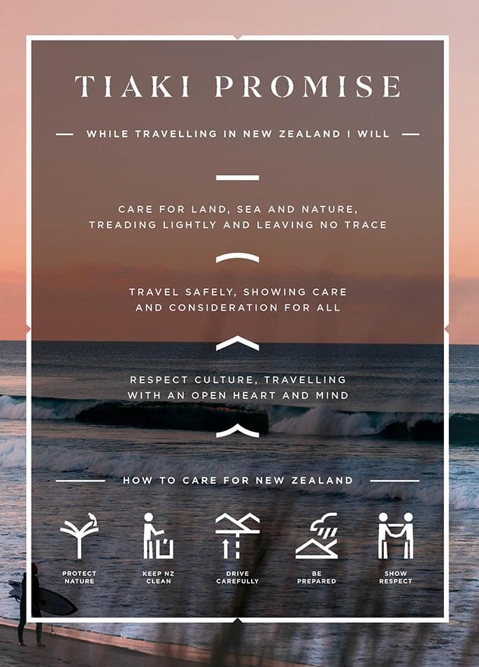 The Tiaki Promise is an initiative to help all our visitors (international and domestic) guard, protect and preserve New Zealand, for now and for future generations. We are all responsible for the care and protection of our beautiful country and can do this by.